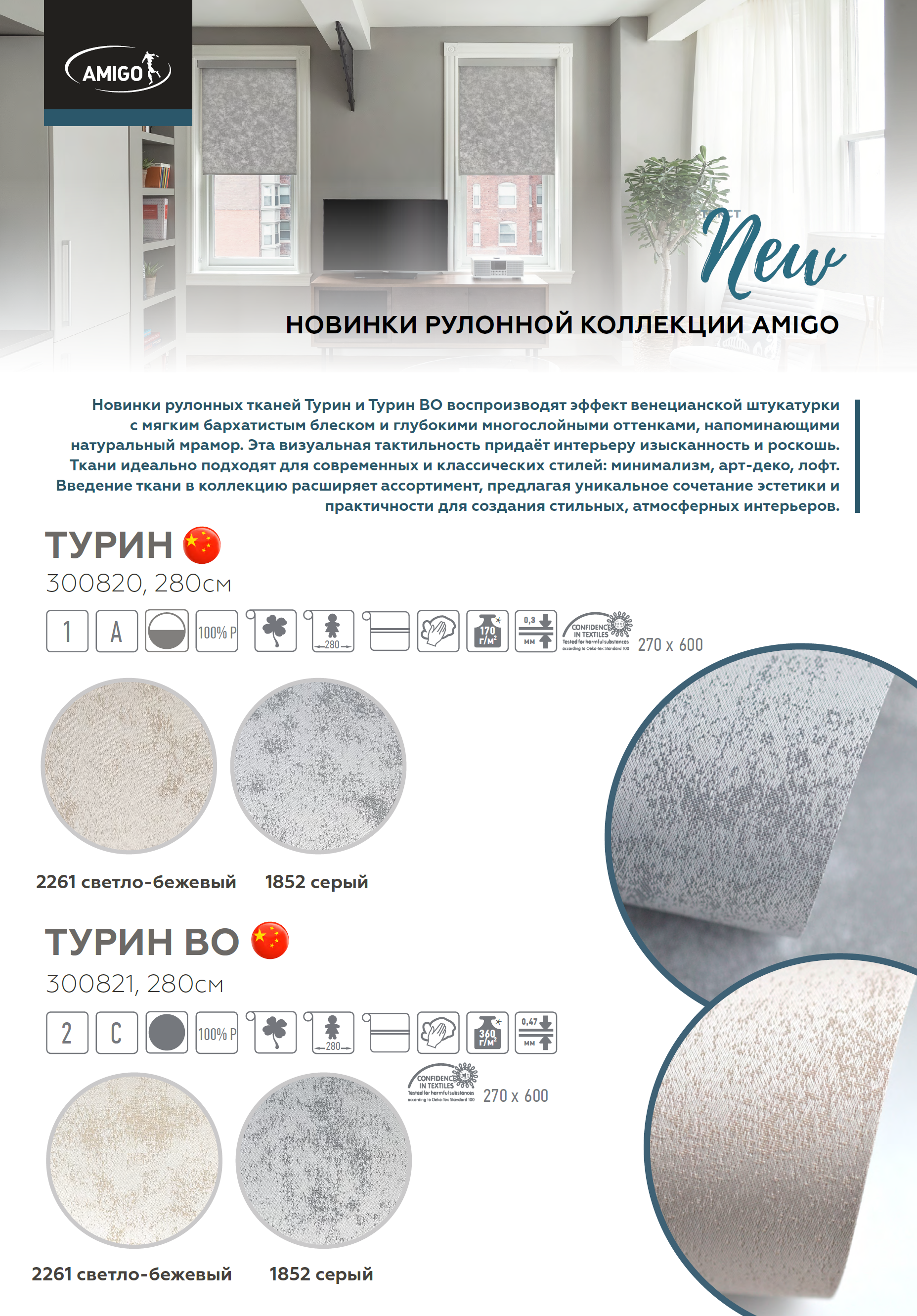 Новинки рулонных тканей Турин и Турин BO воспроизводят эффект венецианской штукатурки
